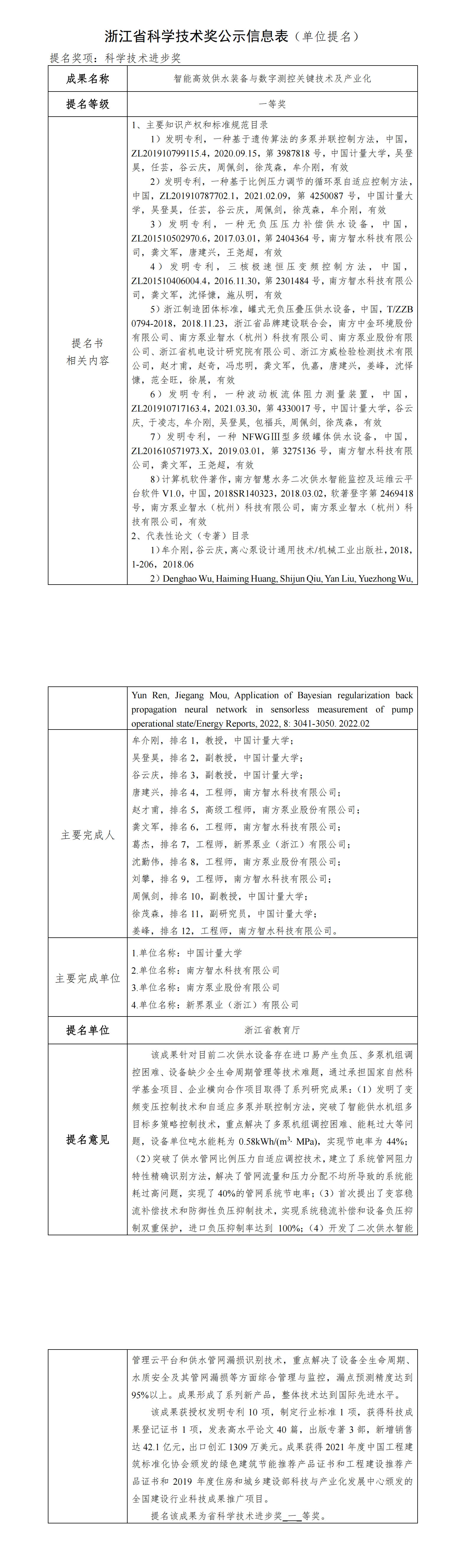 新界泵業(yè)(浙江)有限公司作為主要完成單位參與由中國計量大學作為第一完成單位的成果《智能高效供水裝備與數(shù)字...