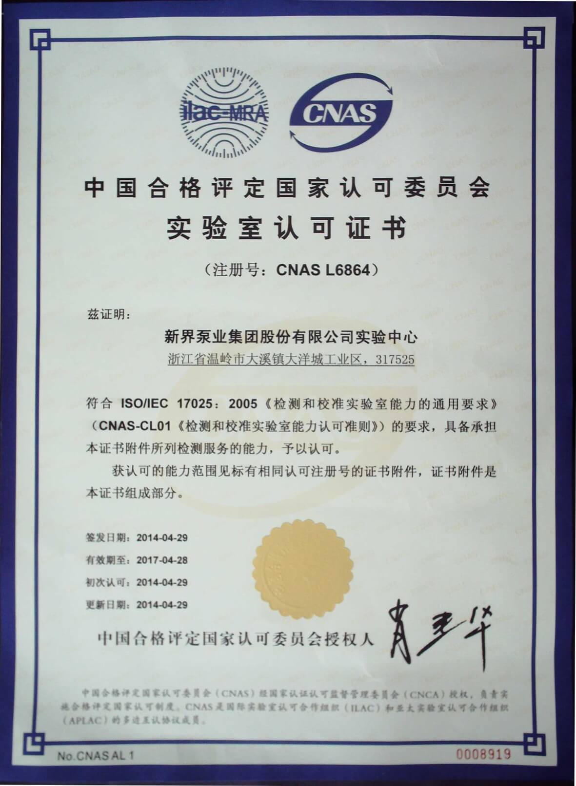 ? ? 新界泵業(yè)集團股份有限公司實驗中心于2014年1月順利通過中國合格評定國家認可委員會(CNAS)委派的專...